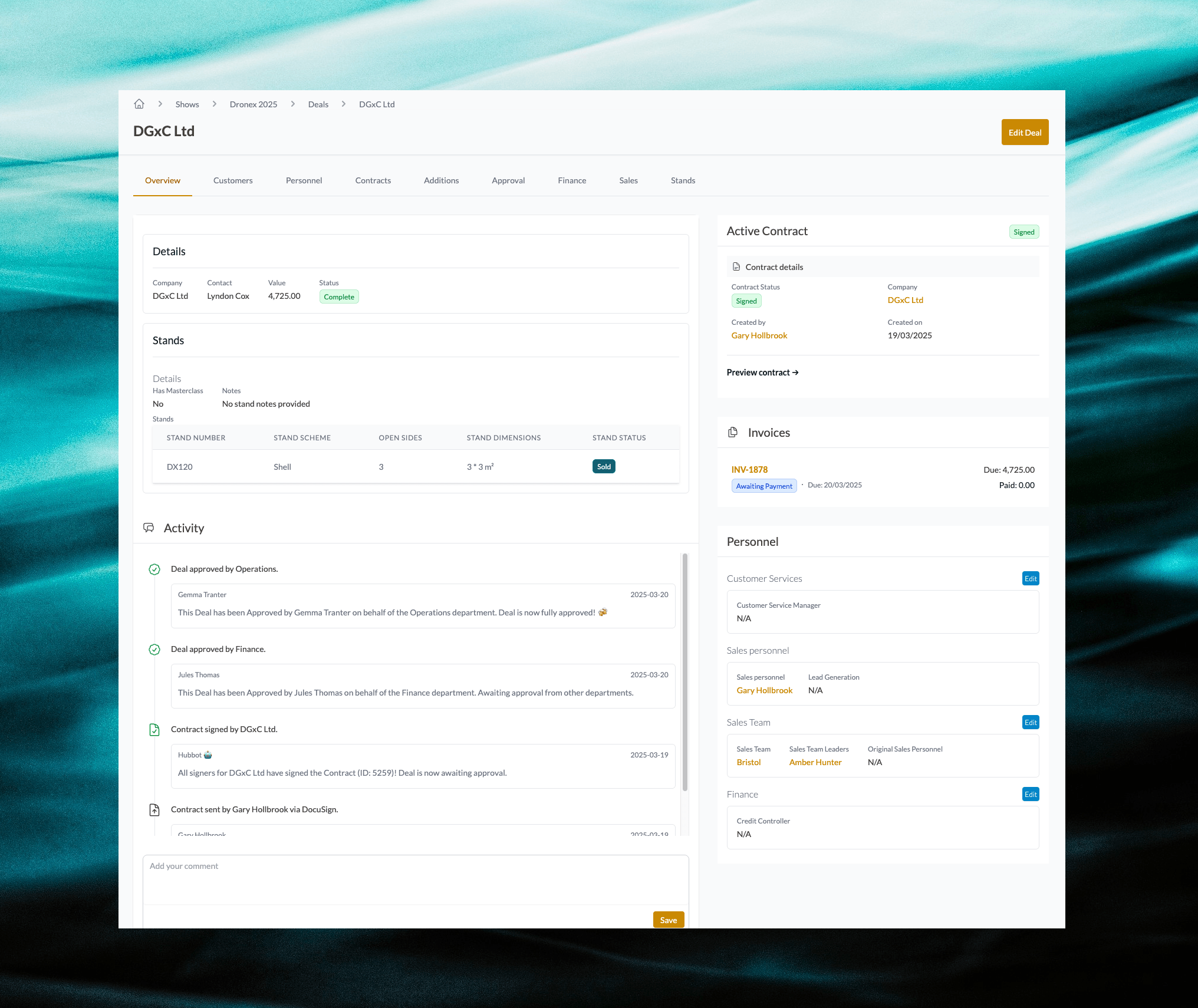 Financial tasks, such as raising invoices, were taking place directly on the accounting system and could only be carried out by certain individuals once a Deal had been approved. This caused a bottleneck in the process and with no visibility over approved Deals, invoices were being missed.
